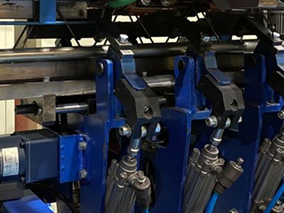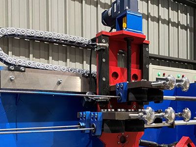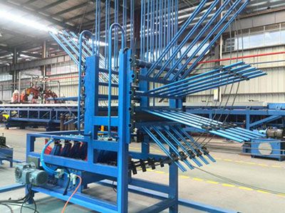 Consiste em um alimentador de barras de aço (para 1 corda superior, 2 cordas inferiores e 2 elementos da banda), dispositivo de medição de barras de aço; todo desbobinador consiste em eixo de liberação do fio, eixo central, plataforma giratória e freio. Peso máximo da bobina: 3T Diâmetro do cilindro pneumático do freio: cerca de φ100 * 50mm; Quantidade: 5pcs.